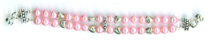 Child's Bracelet: Double strand baby pink glass pearls with silver hearts magnetic clasp 5.75. $9.00 |