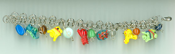 Bracelet: Glass sea creatures and wire wrapped beads dangling from a chain bracelet. $10.00 |