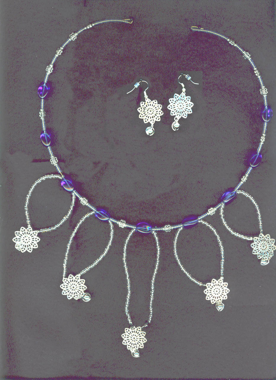 | Necklace set: Aqua and white necklace all glass with silver accents highlighted with floral motif beads with whirl pearls. Heart toggle clasp. 24 $20.00 |