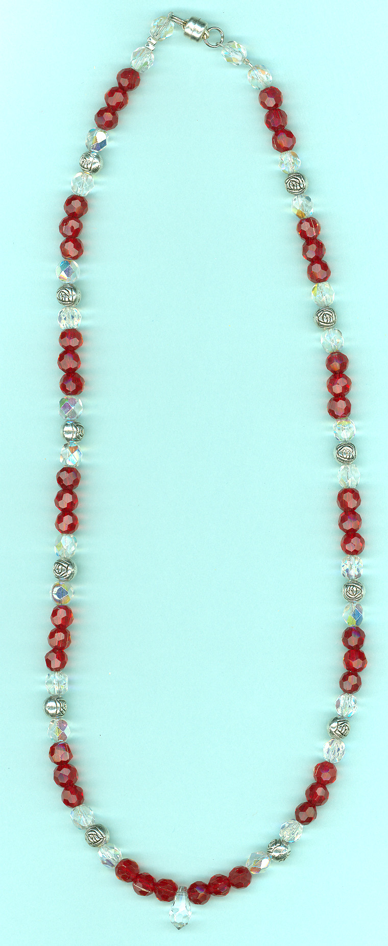 | Necklace: Red and clear AB Czech glass crystals with a Swarovski center drop and silver accents. Magnetic clasp. $20.00 |