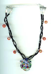 | Necklace: Unique 3-D glass pendant strung from braided suede and chain with millifiore disks dangling from the chain. Adjustable length with chain/lobster claw fastener. $20.00 |